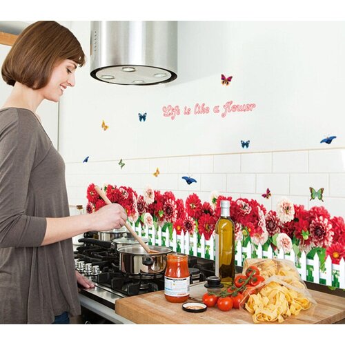 Интерьерная наклейка полоса заборчик с цветами георгины красные размер полосы 120*48 см.