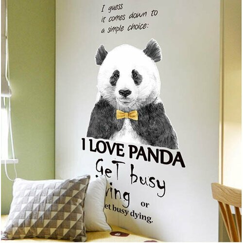 Интерьерная декоративная наклейка на стену "Любимчик Панда" панда с галстуком и надписи на английском. Размер 54 на 101 см.