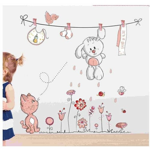 Интерьерная наклейка Зайка игрушка на верёвочке, котик, цветочки
