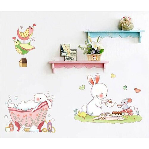 Комплект настенных наклеек кролик в ванне, кролик пьёт чай с мышкой, две птички. Размер композиции на стене 170*55 см.