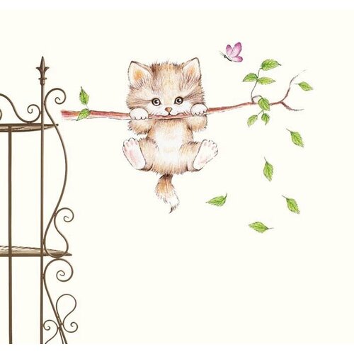 Интерьерная декоративная наклейка "Пушистый котёнок". Котёнок висит на ветке, размер композиции на стене 55 на 70 см.