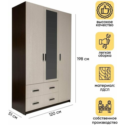 Шкаф распашной Космос 3х дверный с зеркалом и ящиками 1200, Дуб белфорт/Венге