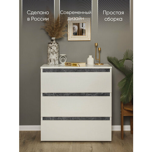 Комод для гостинной спальни детской в прихожую Лотос с 3 выдвижными ящиками, белый (тиснение)/бетон серый