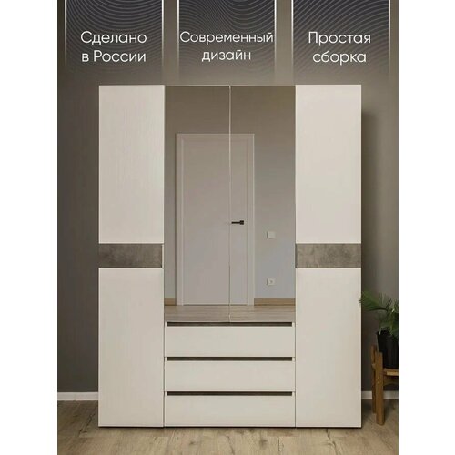 Шкаф распашной 4х дверный Лотос с зеркалом и выдвижными ящиками 1600, Белый - Бетон серый