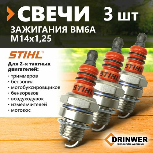 Свеча зажигания 3 штуки STIHL М14х1,25 мм для 2-х тактных двигателей бензопил, бензотриммеров, бензобуров (улучшенная)