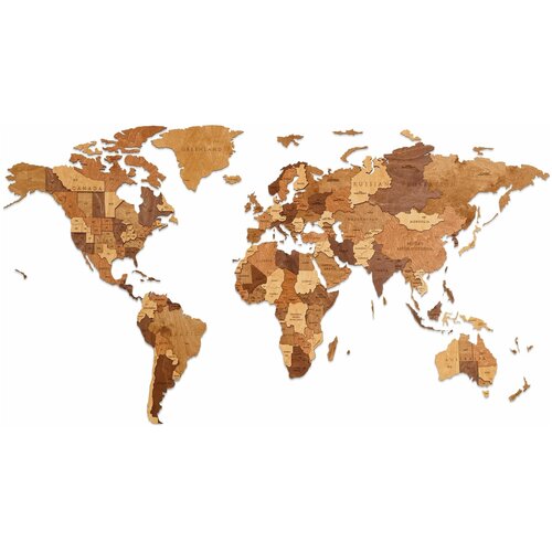 EWA Деревянная Карта Мира настенная, объемная 3 уровня, размер L (192x105 см), цвет шоколад