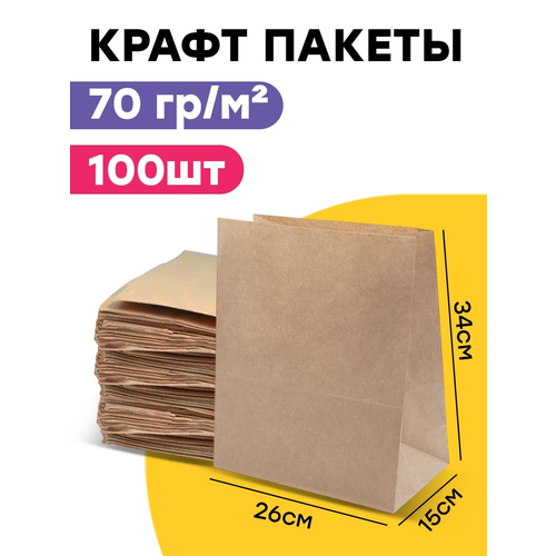 Крафт пакет бумажный без ручек подарочный/Пакет упаковочный крафтовый/34 х 26 х 15 см, 100 шт