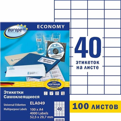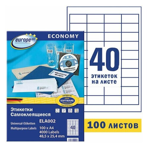 Этикетки Europe100 ELA002-100 ELA002 A4 48.5x25.4мм 40шт на листе/70г/м2/100л./белый матовое самоклей. универсальная