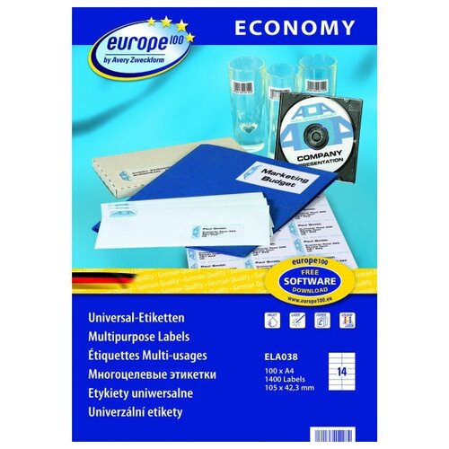Этикетки Europe100 ELA038-100 A4 105x42.3мм 14шт на листе/70г/м2/100л./белый матовое самоклей. универсальная