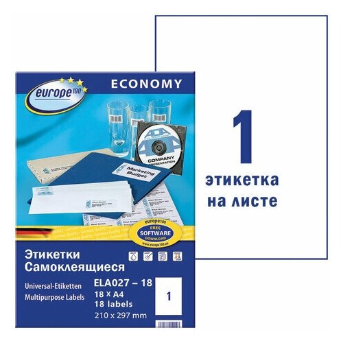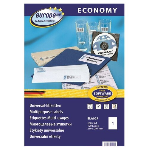 Europe100 Этикетки Europe100 ELA027-100 ELA027 A4 210x297мм 1шт на листе/70г/м2/100л./белый матовое самоклей. универсальная