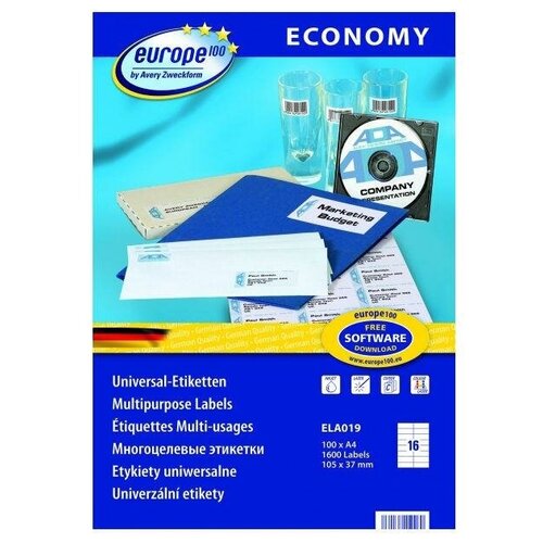Этикетки Europe100 ELA019-100 A4 105x37мм 16шт на листе/70г/м2/100л./белый матовое самокле 100057211594