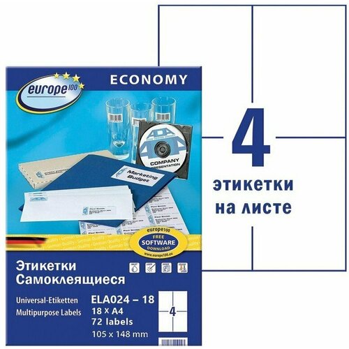 Самоклеящиеся этикетки Европа-100, 105х148 мм, 4 этикетки/лист, 18л, ELA024-18