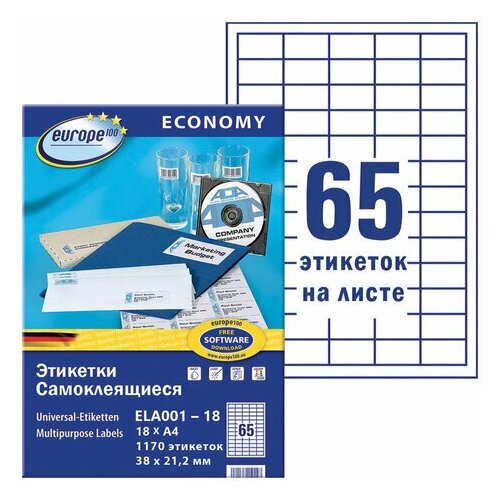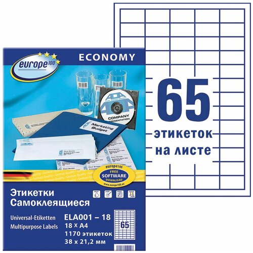 Этикетки самоклеящиеся Europe ELA001-18, 38x21,2мм,65шт на листе А4 18 листов в упаковке
