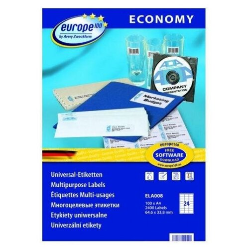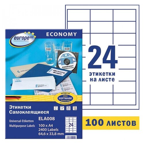 Этикетки Europe100 ELA008-100 ELA008 A4 64.6x33.8мм 24шт на листе/70г/м2/100л./белый матовое самоклей. универсальная