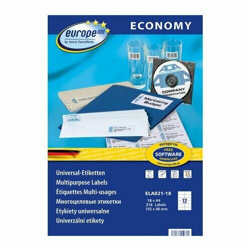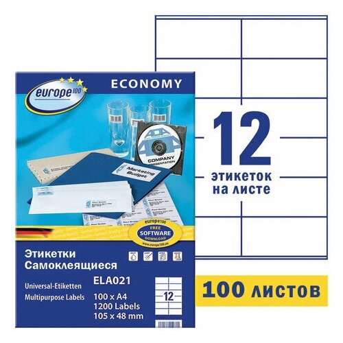 Этикетки Europe100 ELA021-18 A4 105x48мм 12шт на листе/70г/м2/18л./белый матовое самоклей. универсальная