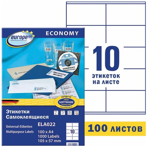 Этикетки Europe100 ELA022-100 ELA022 A4 105x57мм 10шт на листе/70г/м2/100л./белый матовое самоклей. универсальная
