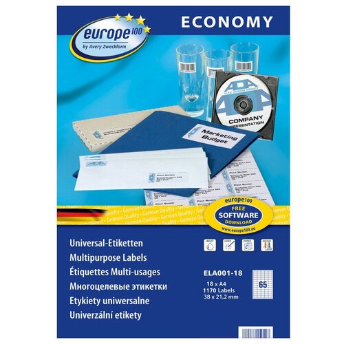 Этикетка самоклеящаяся 38х21,2 мм, 65 этикеток, белая, 70 г/м2, 18 л, Avery, Европа-100, ELA001-18