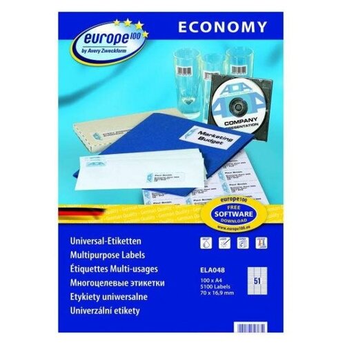 Этикетки Europe100 ELA048-100 ELA048 A4 70x16.9мм 51шт на листе/70г/м2/100л./белый матовое самоклей. универсальная