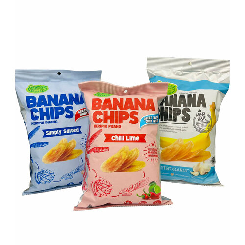 Банановые Чипсы Everything Banana Соленые 70 гр, Чили и Лайм 70 гр, Обжаренный чеснок 80 гр, Индонезия