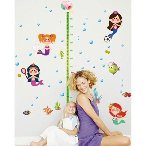 Интерьерная декоративная наклейка на стену ростомер "Ростомер с русалками" размер 138 на 142 см. Рост до 180 см.
