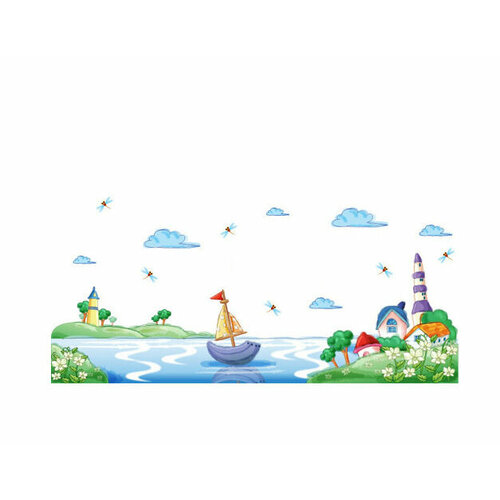 Интерьерная наклейка "Берег" водоём, кораблик, домики, облачка, стрекозы. Детская природная тематика.