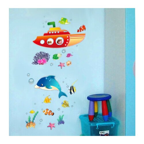 Интерьерная наклейка "Подводная лодка" подводная лодка, дельфин, морские обитатели, для оформления ванных комнат.