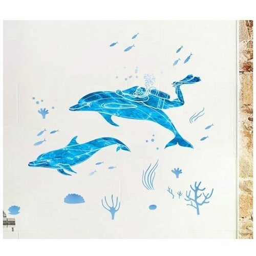 Комплект наклеек на стену два дельфина с аквалангистом и водоросли