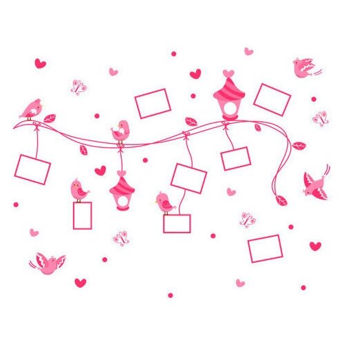 Интерьерная наклейка розовые птички, скворечники, ветки, сердечки и рамки для фотографий
