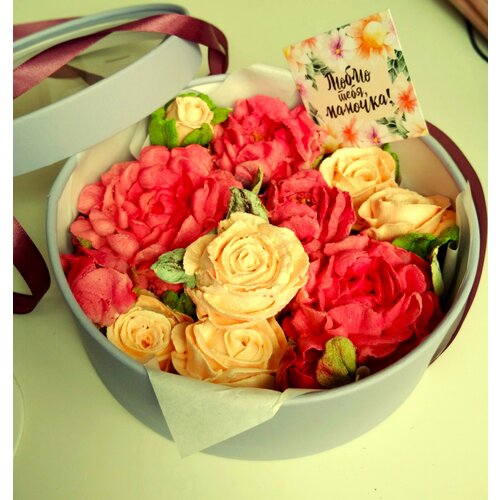 Подарочный набор зефирных цветов ручной работы со вкусом манго натуральным составом в шляпной коробке D18