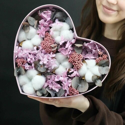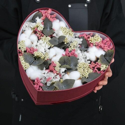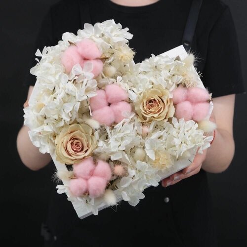 Композиция из сухоцветов с хлопком, гортензией и розами