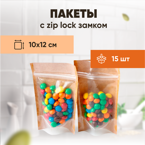 Вертикальные упаковочные бумажные зип пакеты Forceberg HOME&DIY ДОЙ ПАК с замком zip-lock и плоским донышком 10х12 см, крафт/прозрачный, 15шт