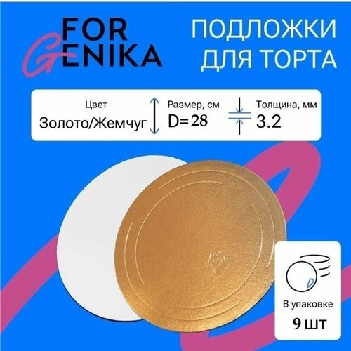 Подложка двухсторонняя 28 см усиленная для торта, пирожного ForGenika, толщина 3,2 мм, Золото/белая, 9 шт