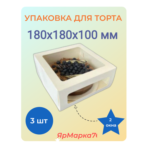 Коробка для сладостей, десертов или бенто торта, 2 окна Window White 180х180х100 мм, 3 шт