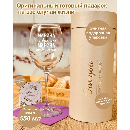 Бокал для вина в подарочной упаковке (тубусе) с гравировкой "Марина не бухает Марина отдыхает