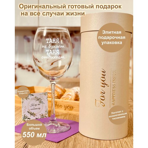 Бокал для вина в подарочной упаковке (тубусе) с гравировкой "Таня не бухает Таня отдыхает