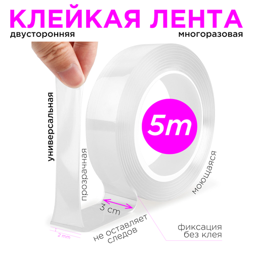 Клейкая лента двусторонняя крепежная стоительная 5 м, двухсторонний прозрачный скотч сильной фиксации для ремонта, поделок , нано лента
