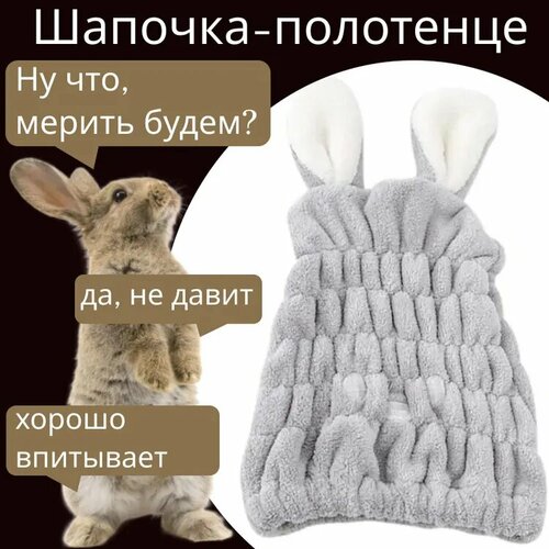 Серая шапочка "Зайчик" для сушки волос после душа / Шапка полотенце с ушками для детей и взрослых из микрофибры после купания, бани и сауны