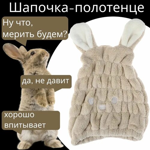 Бежевая шапочка "Зайчик" для сушки волос после душа / Шапка полотенце с ушками для детей и взрослых из микрофибры после купания, бани и сауны
