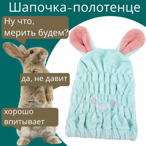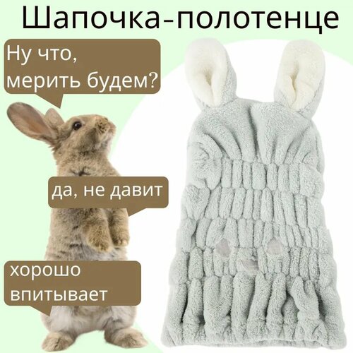 Зеленая шапочка "Зайчик" для сушки волос после душа / Шапка полотенце с ушками для детей и взрослых из микрофибры после купания, бани и сауны