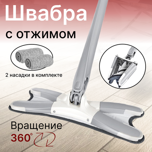Швабра бабочка с отжимом + щёточка + насадка из микрофибры для уборки / Серая, самоочищающаяся, отжимная с телескопической ручкой для мытья полов