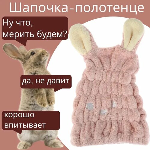 Розовая шапочка "Зайчик" для сушки волос после душа / Шапка полотенце с ушками для детей и взрослых из микрофибры после купания, бани и сауны