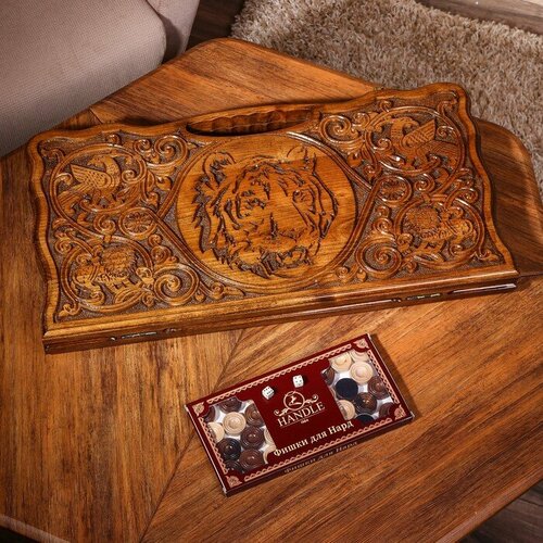 Нарды ручной работы "Лев с инкрустацией", глубокая резка, с ручкой, 60х30 см, с шахматным