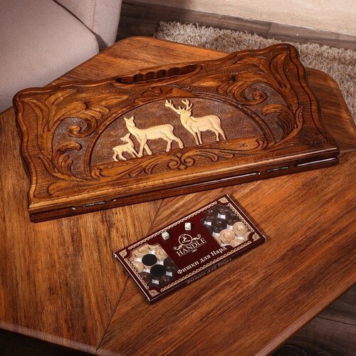 Handle Brand Нарды ручной работы "Олени", глубокая резка, с ручкой, 60х30 см, с шахматным полем, массив ореха, Армения