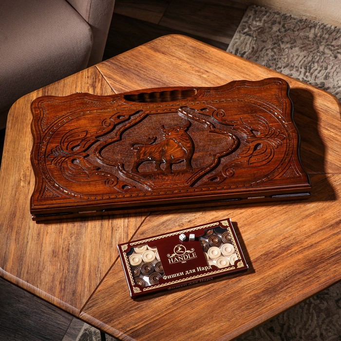 Нарды ручной работы "Бык", с ручкой, 60х30 см, с шахматным полем, массив ореха, Армения