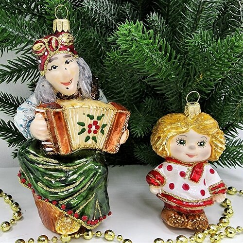 Набор авторских елочных игрушек из стекла Irena-Co Баба Яга с гармошкой и домовенок Кузя