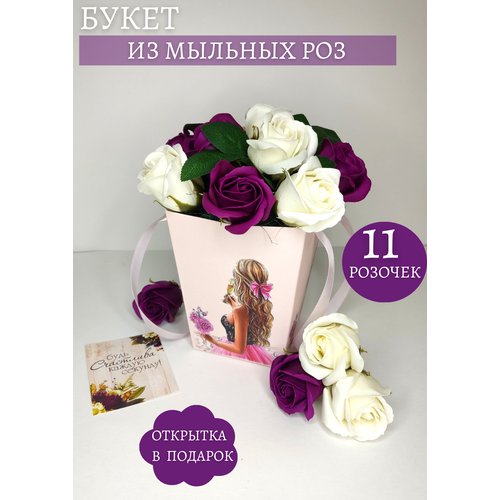 Букет из 11 мыльных роз. Цвет сиреневый, белый