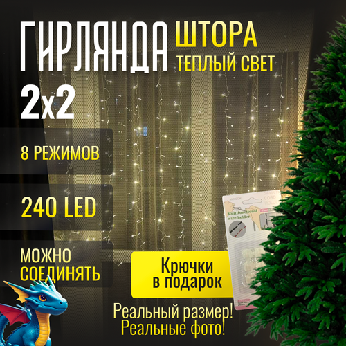Гирлянда Новогодняя Занавес Штора "Белый Теплый Свет" 240 лампочек, 2 метра, питание от сети 220 В + подарок