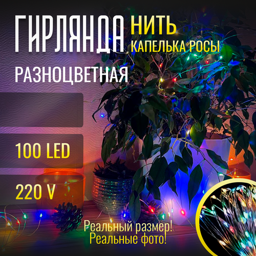 Гирлянда Нить "Капелька Росы" Разноцветный цвет. Светодиодная 100 LED , 10 метров, питание От сети 220В, 1 шт