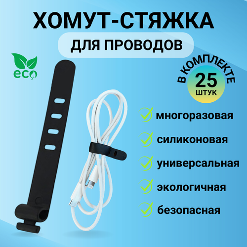 Хомут-стяжка силиконовая для проводов, многоразовый, 25 штук, цвет чёрный, LugHome