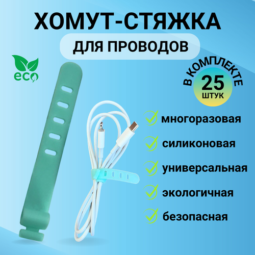 Хомут-стяжка силиконовая для проводов, многоразовый, 25 штук, цвет бирюзовый, LugHome